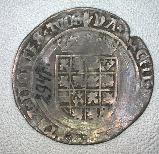 Vz: een lang gevoet kruis, beladen met het binnen een dubbele rand gevatte, gekroon¬de wapen van het Heilige Rooms-Duitse rijk; omschrift: KAROLVS-DxGxROM-IMP+HI-SP[A']+REX, handje