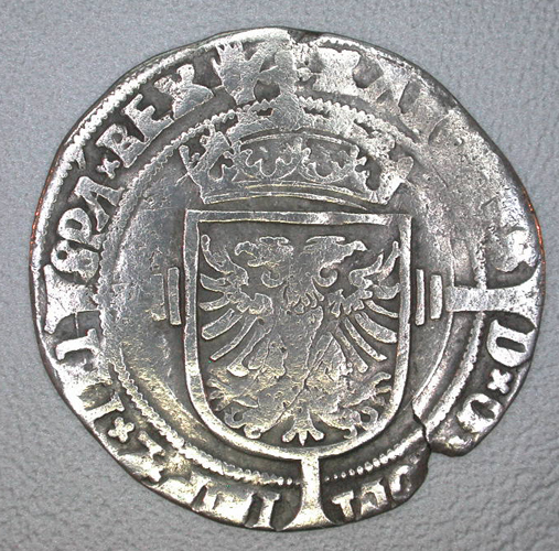 Kz: binnen een dubbele rand het gekroonde Oostenrijks-Bourgondische wapen; omschrift: DA+MICHI+VI[RTVTEx]CO[N]TRA+HOSTES+TVOS, handje