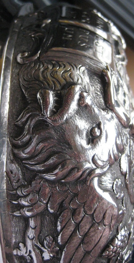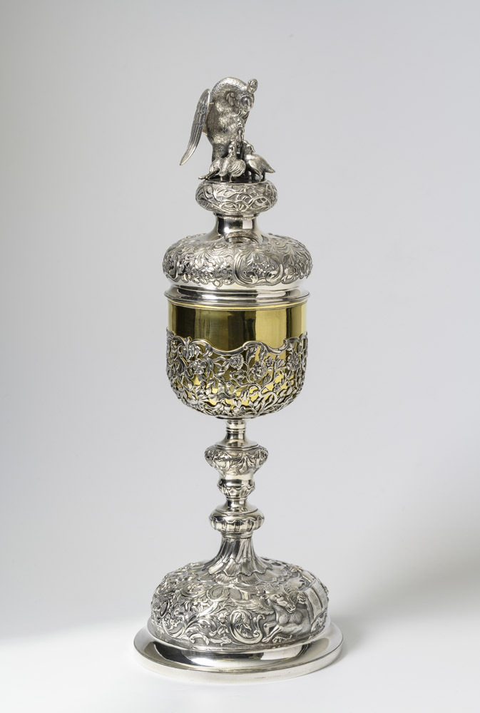 Zilveren, deels vergulde ciborie in Lodewijk XV stijl. De ciborie staat op een ronde voet met gladde, geprofileerde rand. De welving van de voet is versierd met een opengeslagen boek met daarop de tekst HOC EST CORPUS MEUM. Om dit boek heen zijn de symbolen van twee van de vier evangelisten aangebracht; de leeuw (Marcus) en de os (Lucas). Verder is de welving versierd met rocaille motieven. Ook de knoppen van de balustervormige stam zijn versierd met rocailles. De cuppa is geheel glad en verguld waardoor een contrast ontstaat met de opengewerkte tegencuppa die is versierd met voluten en bloemmotieven. De deksel heeft een ingesnoerde welving en is eveneens versierd met rocaillemotieven. De deksel wordt bekroond door een pelikaan, het hoofd gebogen naar de borst, die drie jongen voedt met zijn eigen bloed. Dit laatste is een symbool van de eucharistie waarnaar ook de tekst op de voet verwijst.
