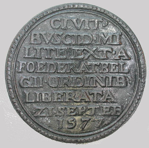 Kz: binnen een parelrand en een getrokken rand, het opschrift: CI¬VIT./BVSCID.MI/LI¬TE.EXT.A/FOEDERAT.BEL/GII.ORDINIBI./LIBERATA/.21.SEPTEB/.1577.