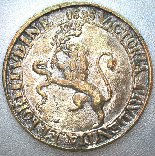 Vz: binnen een getrokken rand, een klimmende leeuw met een olijftak in de ene en een slang in de andere poot; omschrift: VICTORIA.PRVDENTIA.ET.FORTITVDINE 1625