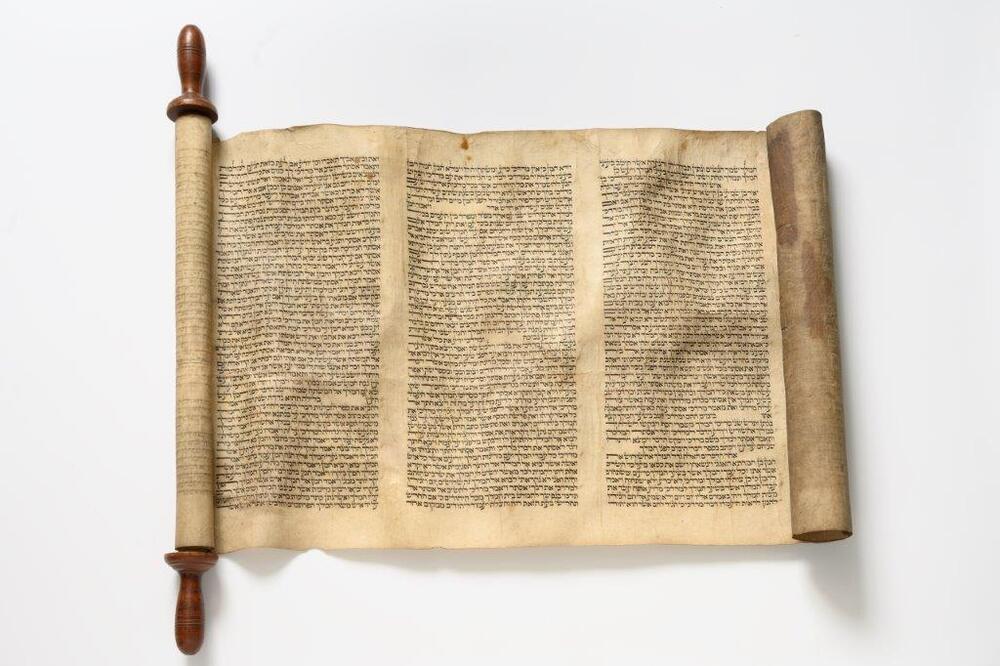 - BeschrijvingRol van twee bladen perkament, met touw aaneengeregen, met het boek Esther, op stok met twee kersehouten, gedraaide handvatten.
