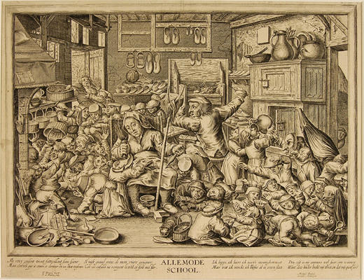 Onderschrift: "ALLEMODE/SCHOOL. Me voicy ceusant tirant, fattroillant sans sciour.Mais conbien que ie oeuvre, ie demeur en un estat tousiours./ Il m'est grand peine, de mon viure gaigner/ Car ces enfans me rompent la teste, et font mal filer./ Ick lappe, ick luere ick naeije mennighen naet./ Maer wat ick wercke, ick blijfue al in eenen staet./ Den cost is mij ommers wel suer om winnen/ .want dees kinder breke mij thoot, en doe mij quaet gare spinnen".