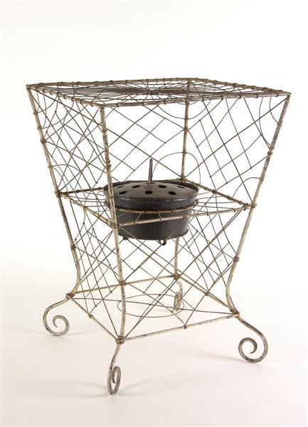 - BeschrijvingRechthoekige stoof van smeedijzer en staven waarvan de zijribben beneden omkrullen tot vier poten. Zijkanten en bovenblad van gebogen en gevlochten draad. Hangend in het midden van de stoof een ronde ijzeren pan met deksel met rechthoekig staand handvat en 13 ronde gaten