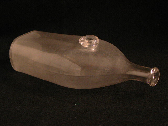 - BeschrijvingFlesje dat zowel kan liggen als staan, met luchtgat, hals en platte rand. volgens Beerendonk een kinderzuigflesje.