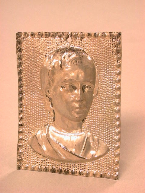 - BeschrijvingRechthoekig plaatje met jongenskopje 'en trois quart' naar rechts. Om het geheel een parelrand middenboven een gat.