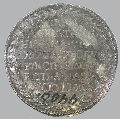 Kz:binnen een lauwerkrans het opschrift: .BREDA./.A.SERVITVTE/HISPANA.VIN/