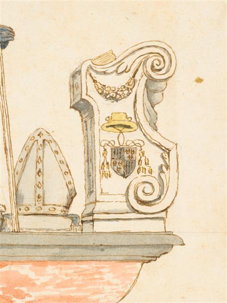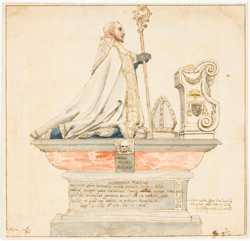 Op de tombe in bruine pen: "GISBERTVS MASIVS/Hic iacet: quem bommelia mundo protulit, ducissilua/insula excepit, mors virtutibus Casmisq(ue) auctem (dit woord doorgehaald) auctum intercepit./quid hic triumphas germana somni. itte tibi reddidit, quod/debuit et quod non debuit, in patriam transtulit./obijt ii.iulii.Ao.Ci>.I>.C.XIV.". Daarboven in bruine pen: "OMNIA/MORS/AEQVAT". Linksonder in de tekening in bruine pen: 1632 6/30. Rechtsonder in de tekening in bruine pen: "aen de ander zijde was ook soo/een punt als dit is/is by/mijn versuymt te maecken".