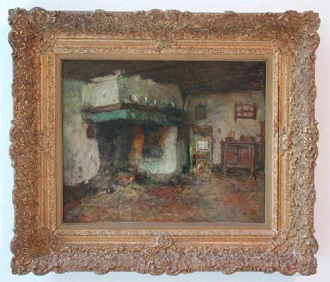 - BeschrijvingInterieur met een hoge schouw met daarop borden. Boven het vuur hangt een ketel.