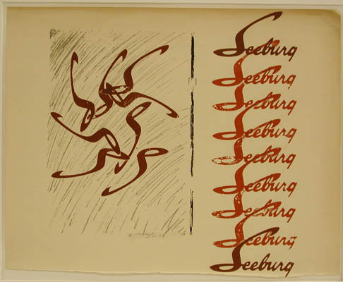 - BeschrijvingAan de linkerzijde van de voorstelling is negen maal het woord "Seeburg" onder elkaar geschreven. Aan de linkerzijde van de voorstelling is acht maal de letter "S" geschreven in een cirkel, waarbij een soort rad ontstaat.