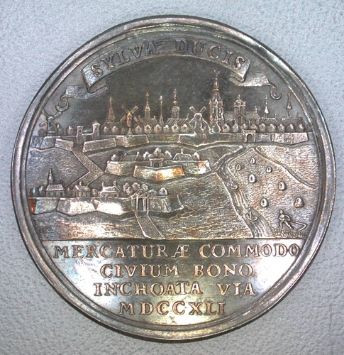 Vz:gezicht op de stad van de Vughterzijde; op de voorgrond de straatweg langs de schans Sint Antonie en door het fort Isabella; op de Dieze twee scheepjes. Opschrift banderol: SYLVADUCIS, in de afsnede: JCM en MERCATURAE COMMODO/ CI¬VIUM BONO/INCHOATA VI¬A/ MDCCXLI