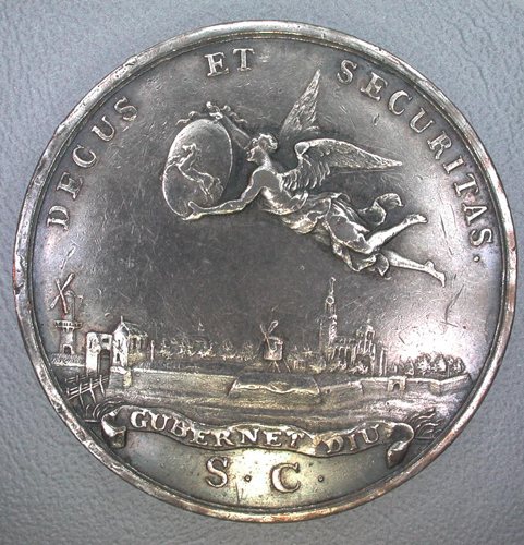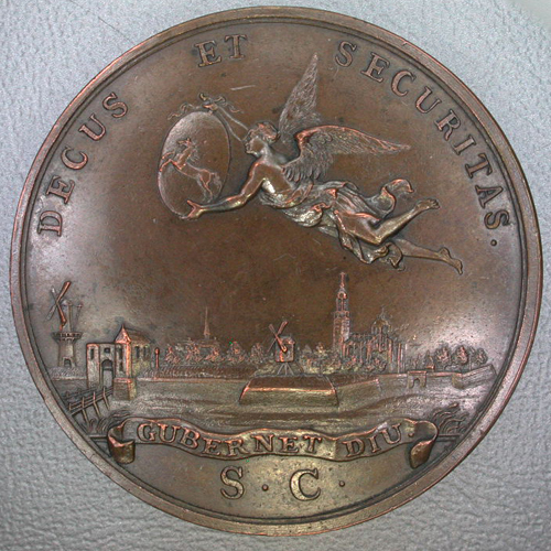 Vz:gezicht op de stad van de Vughterzijde; een vliegende engel en het wapen van de Hertog van Brunswijk Wolffenbüttel ("de dikke hertog") boven de stad. Opschrift: DECUS ET SECURITAS., onder de voorstelling op een banderol: GUBERNET DIU., in de afsnede: S.C.