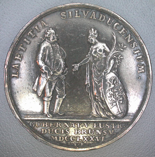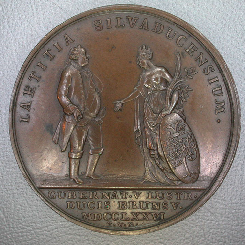 Kz:de stedemaagd van 's-Hertogenbosch met palm- en olijftak en het stadswapen. Zij brengt hulde aan de Hertog van Brunswijk. Opschrift: LAETITIA SILVADUCENSI¬UM., in de afsnede: GUBERNAT.V LUSTR./DUCIS BRUNSV./MDCCLXXVI/T.V.B.