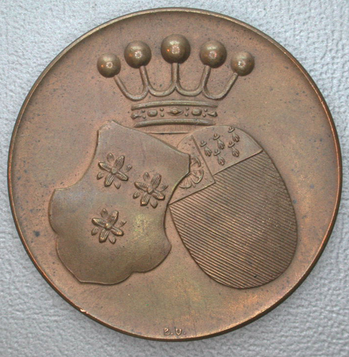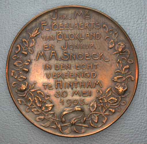 - BeschrijvingHuwelijkspenning van Jhr. Mr. F. Beelaerts van Blokland en Jkvr. M.A. Snoeck te Hintham brons, geslagen; ΓΈ 29 mm Vz:de familiewapens Beelaerts van Blokland en Snoeck onder een kroon Kz:binnen een krans het opschrift: JHR.MR/F. BEELAERTS/VAN BLOKLAND/EN JONKVR./M.A. SNOECK/IN DEN ECHT/VEREENIGD /TE HINTHAM/ 30 MEI/1905.
