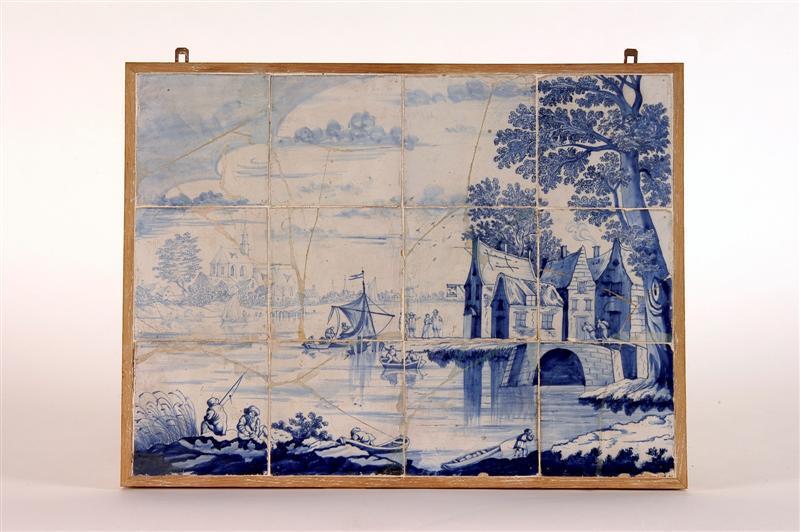 Schilderstuk op tegels in blauwe kleur. Het tableau bestaat uit 12 tegels.