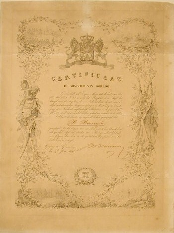 - BeschrijvingOorkonde van een officier der Noord Brabantse Vrijwillige Jagers (1831-1839).