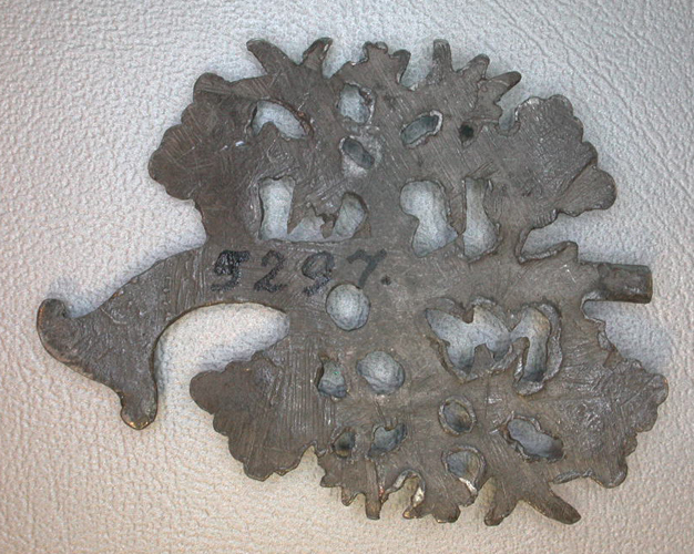 - BeschrijvingVoorzijde: Model van het juweel, waarnaar het in zilver werd afgegoten.