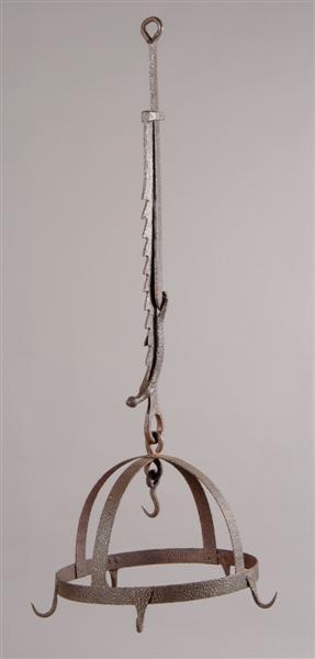 - BeschrijvingDriedelig zaaghaal: glijstang, zaagdeel, stelhaak,vaste schakel met daaraan een vleeskroon, ijzeren hoepel met 2 gebogen over elkaar kruisende banden, aan de hoepel vastgeklonken en vervolgens eindigend in haken.