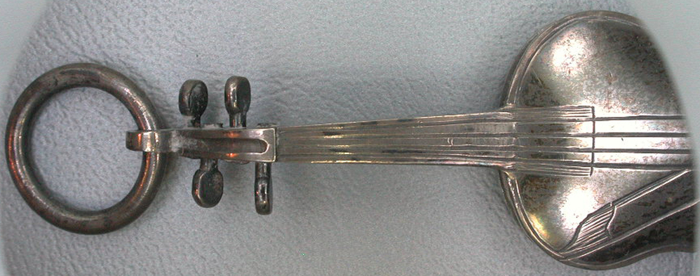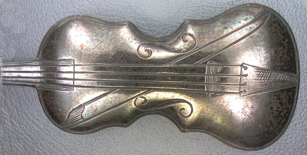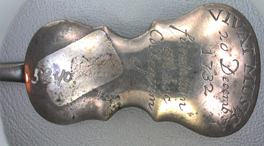 - BeschrijvingInsigne in de vorm van een viool. Op de keerzijde de inscriptie VIVAT MUSICA/20 Decemb. 1732/fundatum/est hoc/Collegium