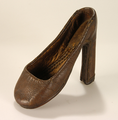 - BeschrijvingBruin leren damesschoen met zeer hoge, rechte hak. De voorschoen raakt met de rand van de zool de grond. Houten blokje boven de hak. Onder de hak een metalen ("hoef")-ijzer, met 4 spijkers aan de hak bevestigd.