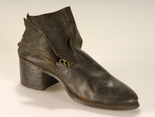 - BeschrijvingZwarte leren herenschoen. Grote, middelhoge hak, ronde neus. Tong, breed uitlopend in punten. Midden op de tong 3 gaatjes. Wreefbandjes die over de tong vallen.