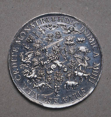 Vz: de Nederlandse leeuw verdrijft gedrochten uit een bos (Den Bosch); omschrift: HINC INIMICA MIHI, SILVA EST MEA, CEDITE MONSTRA