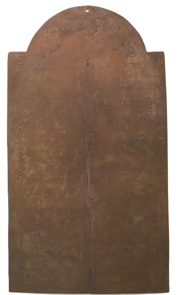 Gegraveerde namen der meesters, voorzien van een jaartal (jaar van de meesterproef) gestempelde meestertekens, jaarletters en enkele stadskeuren. N.B. deze gegevens komen ook op klein gedeelte van de achterzijde voor (doorlopend) Periode 1772- 1799 (voorzijde) 1801-1807 (achterzijde). Halfronde bovendeel: gegraveerd rocaille-ornament.