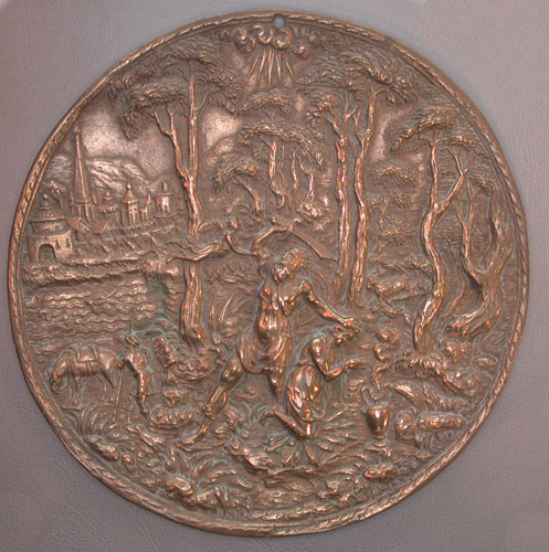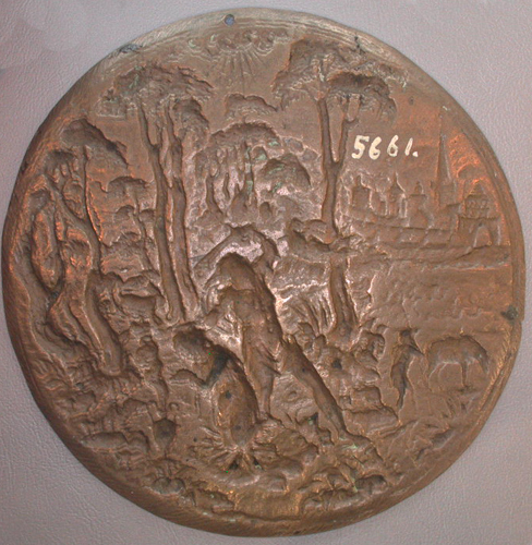 (Penningplaat) Abraham staat gereed om zijn zoon Isaak te onthoofden, een stad in