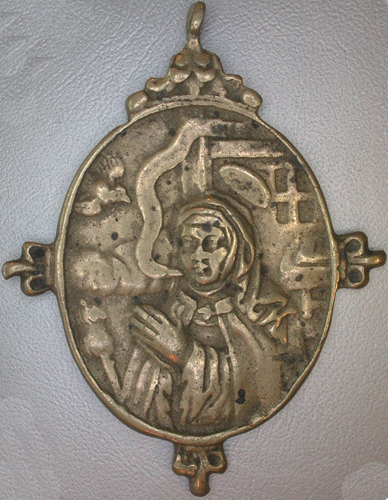 Ovale penning, biddende non met attributen.