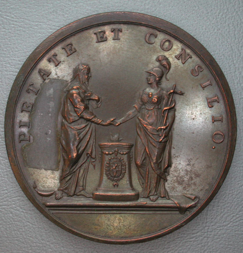 Kz:boven een brandend altaar met het Starhembergse wapen reiken Pietas (links) en Sapientia (rechts met Mercuriusstaf) elkaar de hand; omschrift: PIETATE ET CONSILI¬O.