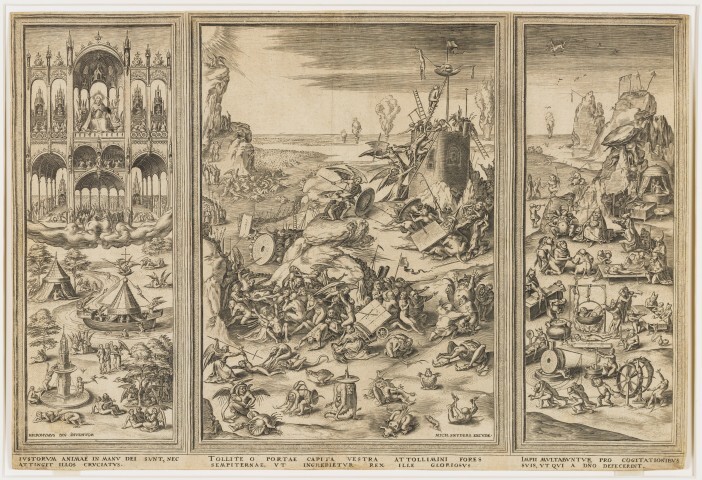 - BeschrijvingDrieluik. Links: de Paradijstuin met de engelen en uitverkorenen. In de tuin zijn onder andere een schip met engelen, een levensbron en musicerende engelen. Midden: de strijd tussen engelen en duivels om de zielen van de mensen. Rechts: folterscenes die de mensen in de hel te wachten staan.
