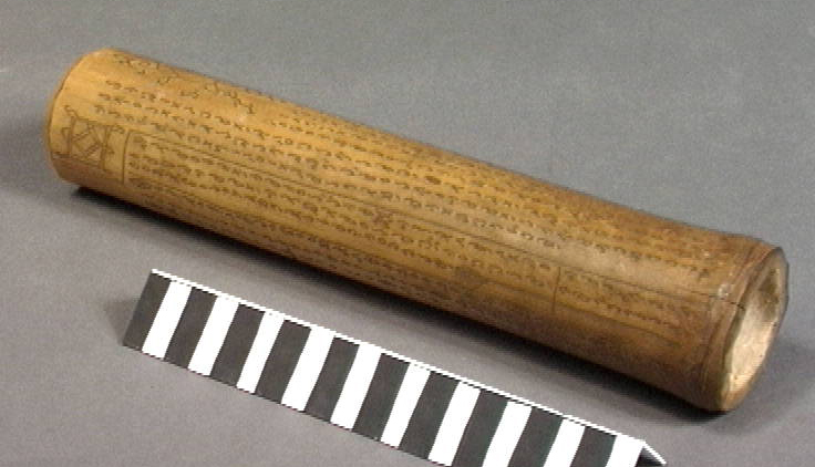 Bamboekoker met ingegrift schrift, afkomstig uit de Bataklanden.