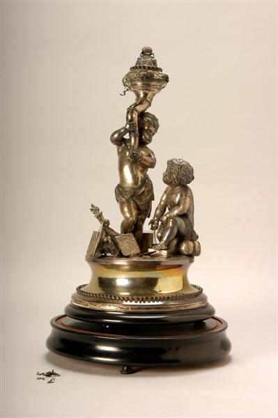 Tafelstuk op losse zwarte voet, bijbehorende glazen stolp ontbreekt. Twee putti in lendendoek op een voetstuk. Een putto staande met hoorn des overvloeds, met de voet op een voorhamer, een putto zittend op een baal, in de hand een weegschaal. Op de voorgrond een Korinthisch kapiteel, waartegen een fakkel, passer en pallet met drie penselen.Daarbij drie accolade-schilden, waarvan een met het wapen van 's-Hertogenbosch, een met het wapen van de familie De Kuijper en een met de tekst: "DE GEMEENTE/ 's-HERTOGENBOSCH/aan haren gewezen /Burgemeester/ Mr.E.J.C.M. de Kuijper/11 Februarij 1857/9 October 1874"