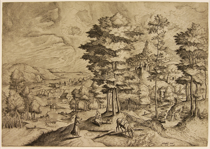 - BeschrijvingGezicht op een landschap waarin links een riviertje loopt, op de rivier varen enkele scheepjes. Op de rechteroever staat een klooster. Op de voorgrond, op een boomstam, zit Maria het kind te voeden. Joseph komt van links aanlopen, rechts op de voorgrond graast een ezel.