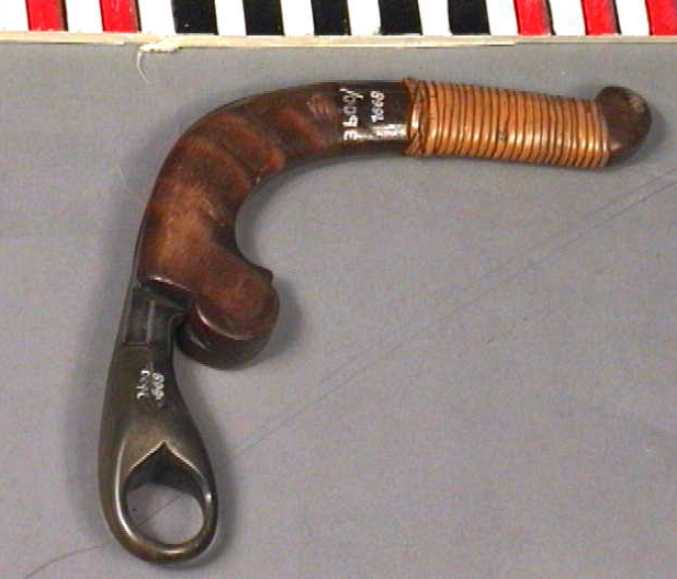 Maleise kromme dolk. Ook wel genoemd: buiksnijder, koerambit of krombie. Midden-Sumatra.
