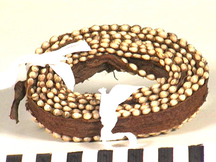 Band van plantenvezels, doorboord en versierd met een rij schelpen.