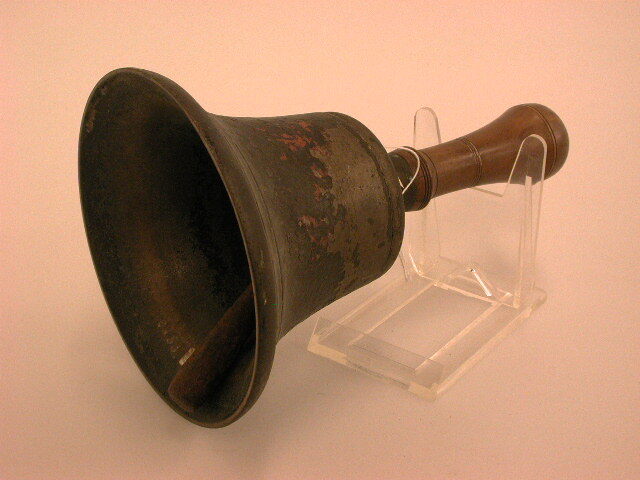 - BeschrijvingBronzen bel (klokvorm) met ijzeren klepel en houten handvat. De bel is zwart geverfd geweest.