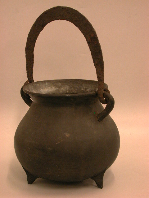 - BeschrijvingKoperen bolvormig lichaam op drie korte pootjes. Dito wijde, sterk uitbuigende rand met twee staande oren naar lichaam, waaraan scharnierend, plat ijzeren hengsel.