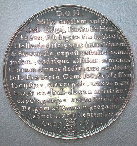 Kz: vijftienreglig opschrift waarin het wapenfeit beschreven wordt; ter weerszijden van het Zeeuwse wapen onder de afbeelding: Anno-1631./J.L.-fecit