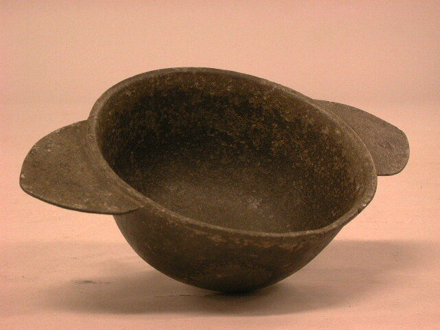 - BeschrijvingZwaar gegoten tinnen papkom met twee aangegoten "spitsboogvormige" oren. Het vrij diepe kommetje heeft een verdikte bovenrand en een standring.