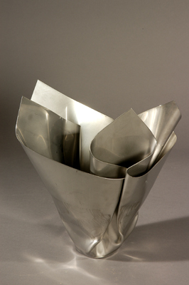 - BeschrijvingDe vaas is met behulp van een dieptrekmachine uit een plaat staal gevormd. Het gebeurt opzettelijk niet precies zodat er telkens een andere vaas ontstaat. Omdat de mallen niet perfect zijn, is het proces in bepaalde mate oncontroleerbaar. Op de vaas zijn de sporen van het dieptrekken nog zichtbaar; zij maken deel uit van het concept.