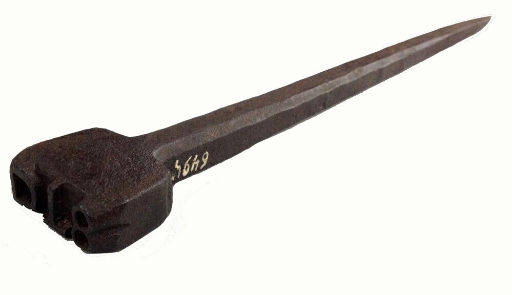 - BeschrijvingRechthoekig blokje, met brandletters d(in)T(her) 8, op lange pin