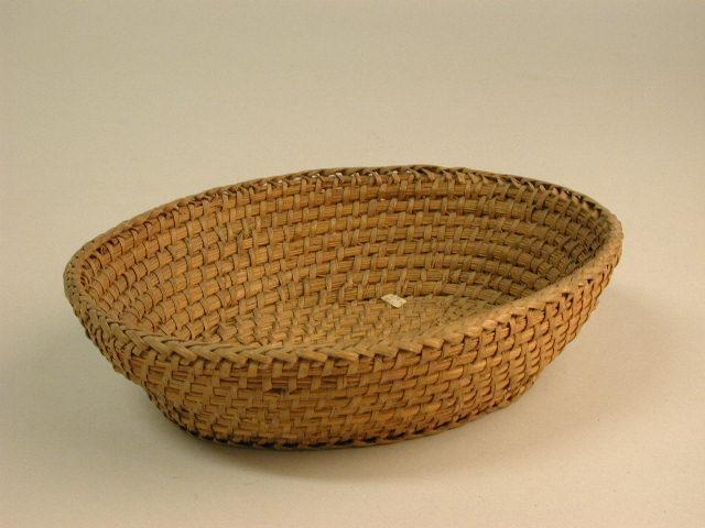 Spiraalsgewijs opgebouwd ovaal mandje met schuine rand, van met riet omvlochten grasbundels