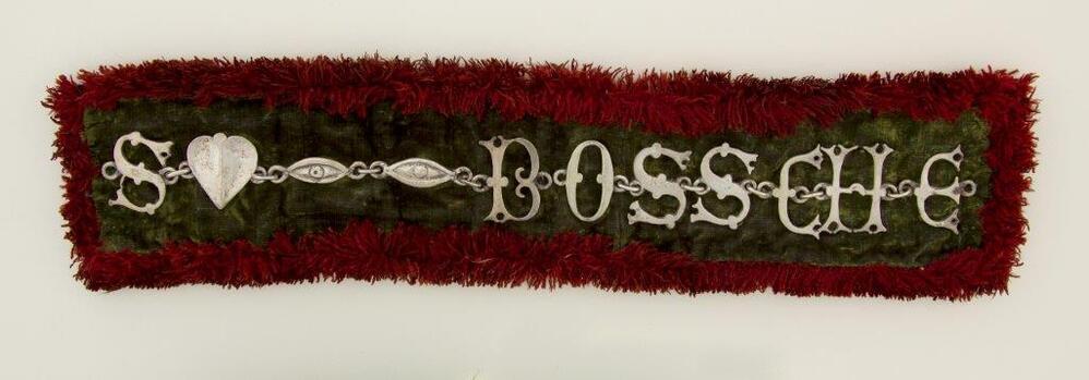 - BeschrijvingGroen fluwelen armband, waarop in rebusvorm met symbolen en letters in zilver de naam van de stad hart-ogen-BOSSCHE is aangebracht. Letters en symbolen zijn onderling verbonden door schakels. Banden zijn afgezet met rode franje. Deze armbanden werden gedragen door de stadspijpers van 's-Hertogenbosch