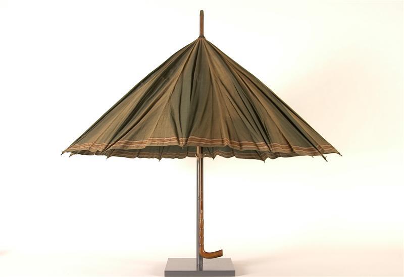 - BeschrijvingBoerenparaplu met houten stok. Handvat met gedraaide steel. Zwartgelakte metalen baleinen. Groen katoenen scherm met ingeweven strepen in wit, rood, geel en bruin. Stok met koperen punt