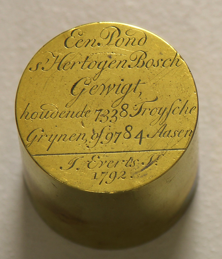 - BeschrijvingGewicht Inscriptie bovenzijde: "Een Pond/ s'Hertogenbosch/ Gewigt,/ houdende 7338 Troysche/ Grijnen, of 9784 Aasen" Inscriptie onderzijde: "Naar verschijde/ over een stemmende/ oude Slapers van den/ Jaare 1719 by de Stad/ nog voorhanden."