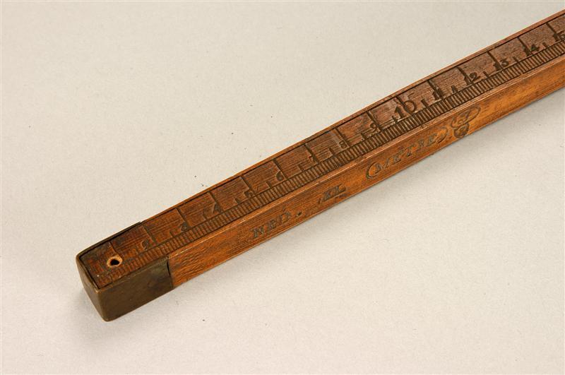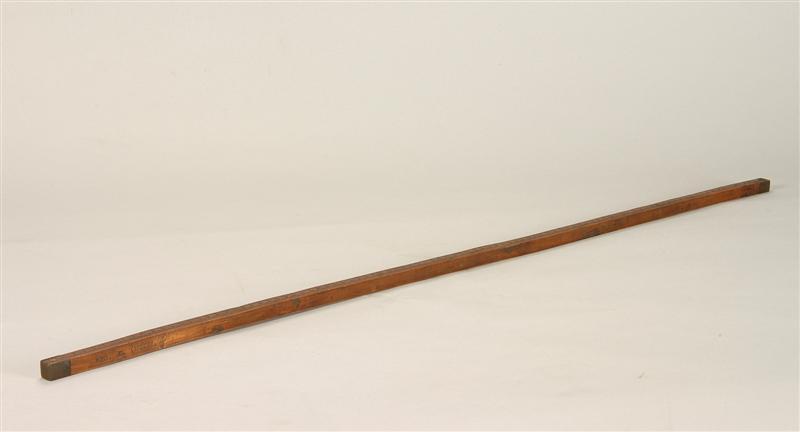 Op een zijde: gegraveerde maatverdeling van 1 meter, in milimeters nauwkeurig. Op aangrenzende zijde: "NED.EL (METER)" en 2 tekens