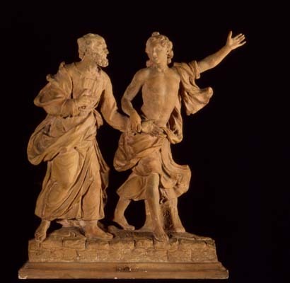 Dit beeldengroepje van Petrus en de engel uit 1749 is de plastische uitwerking op kleine schaal van een altaarontwerp van Walter Pompe uit 1743. Hoofdonderwerp van dit retabel is de wonderlijke bevrijding van de apostel Petrus uit de gevangenis. De scene wordt bekroond door God de Vader omgeven door engeltjes, de Heilige Geest en het Alziend Oog, en is geflankeerd door twee grote beelden van de apostel Paulus en Johannes de Doper (Kon. Musea voor Kunst en Gesch. Brussel inv.nr. 8852/72a-b). Het altaar werd in 1750 uitgevoerd blijkens de gedateerde fragmenten van de Petrusfiguur, de engel en twee slapende soldaten (Antwerpen, Oudheidkundige Musea, Vleeshuis). Het terracotta beeldengroepje zal als modello hebben gediend voor de levensgrote houten beelden die Pompe in 1750 sneed. De op de sokkel aangegeven maataanduidingen slaan waarschijnlijk op de afmeting, en wel op de breedte van het voetstuk, nl. 3,5 duim (vermoedelijk Rijnlandse duimen. 3,5 Rijnlandse duim komt overeen met 9,16 cm, wat redelijk correspondeert met de werkelijke maat (ca. 9 cm).