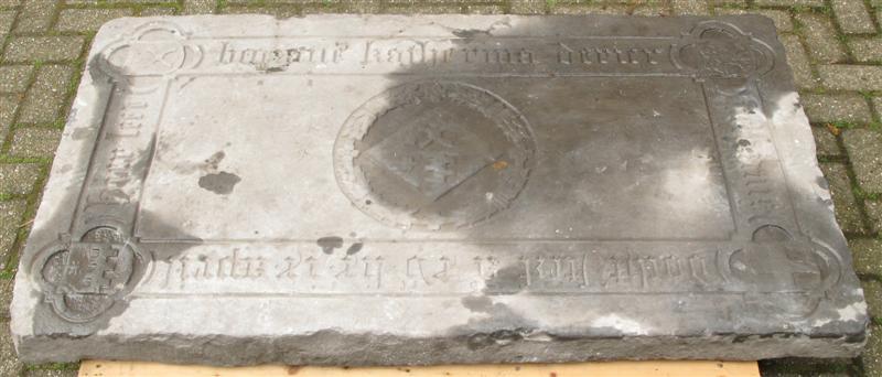 Tekst langs de vier randen, in gotisch schrift. In de vier hoeken een familiewapen. Linksboven bij bogen beurtelings gekanteelde balk. Rechtsboven een vogel (merlet?) boven gebogen Andrieskruis. Linksonder een kruis. Rechtsonder een dubbele adelaar. Centraal zie je een door een lauwerkrans omgeven ruitvormig wapen, gedeeld. Links is als rechtsboven en rechts is als linksboven. Catharina Pelgrom was kanonikes van het voormalig klooster Bethanie.