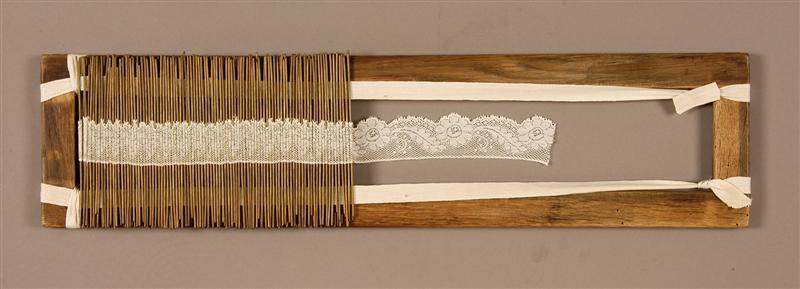 - BeschrijvingHouten plooirekje met omgeknoopt wit linnen bandje. Op het rekje is met gehulp van veel koperen rietjes een strook machinale kant met bloemmotief van ca 3,7 cm breed geknoopt. Bijgevoegd zijn een fragment van dezelfde kant en losse rietjes